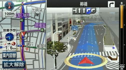 全国の道幅データにより、細街路、1車線、2車線、3車線以上の道路を高速道路、国道、主要道、県道、その他の道路で色分け表示し、広い道は太く、狭い道は細く、実際の道路状況をナビゲーション画面にリアルに再現しています。また、学校や駅などの施設マークをイラスト的に表示します。