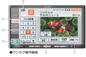 | 映像画面とナビゲーション画面を同時に表示するマルチ画面※1に切替わります。 マルチ画面からワンセグ操作画面に切替えたいときは、映像画面にタッチします。 |