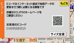 にタッチすると、Eコード読み込み画面が表示され、2010年夏よりインターネット経由で地図データの更新を行うための情報が取得できる予定です。詳細については、下記URLへアクセスしてください。
