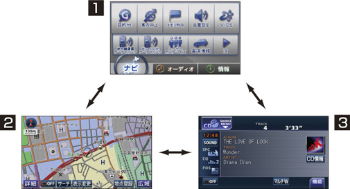 本機には大きく分けて「MENU」「ナビゲーション」「オーディオ」の3つのモードがあります。
