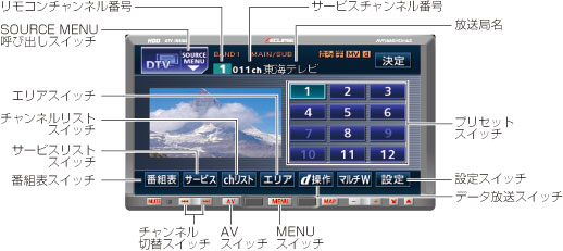 エンジンスイッチがONまたはACCで、さらに安全上の配慮から車を完全に停止し、パーキングブレーキをかけた場合のみ、地上デジタルTV放送をご覧になることができます。(走行中にソースをDTVに切り替えた場合、音声のみになります。)