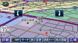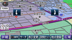 全国の道幅データにより、細街路、1車線、2車線、3車線以上の道路を高速道路、国道、主要道、県道、その他の道路で色分け表示し、広い道は太く、狭い道は細く、実際の道路状況をナビゲーション画面にリアルに再現しています。また、学校や駅などの施設マークをイラスト的に表示します。