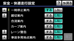 安全・快適走行設定では、運転中に注意する地点の案内について設定することができます。
