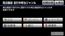 • 初期状態 にタッチすると、すべての周辺施設 走行中呼出ジャンルの項目が初期設定の状態にもどります。