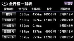目的地を設定すると推奨ルートが探索され、現在地から目的地までの全ルート図が表示されます。推奨ルート以外に有料道路優先ルート、一般道路優先ルート、距離優先ルート、別ルートの合計5ルートを同時表示させて選ぶことができます。探索が終了したルートから順に表示されます。