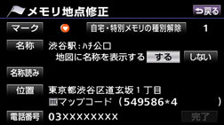登録したメモリ地点は、メモリ地点修正画面から種別を変更したり、マーク、名称、名称読みなどを修正、入力することができます。