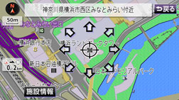 • 3D表示にしているとき、25mスケールの市街図表示に切り替えると、自動的にバーチャタウンマップ表示になります。バーチャタウンマップ表示の操作については、バーチャタウンマップを表示するを参照してください。