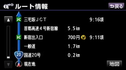 目的地までのルートを、設定した地点、乗降インターチェンジ(IC)、道路の種類別などに区分し、区間の距離、高速道路などの料金、または目的地や乗降インターチェンジ(IC)の通過予想時刻を一覧で表示することができます。また、出発した地点・目的地などの周辺地図を表示することもできます。