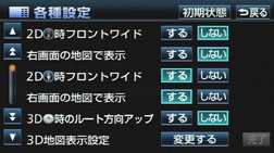目的地の設定で呼び出した地図・全ルート図表示画面などは、3D表示が解除されますが、現在地画面にすると、3D表示にもどります。