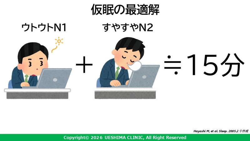 渥美氏:N1は、いわゆる「うとうと」状態で、本人は「起きている」と感じていることが多いです。「すやすや」状態のN2になると本人に起きている意識はありません。入眠からN2に達するまでにかかる時間は、個人差や年齢差などはあるもののおおよそ10〜15分。そのため、15分前後の仮眠時間が、多くの人にとって脳の覚醒・疲労回復・集中力向上のバランスが最もよい長さとされています。