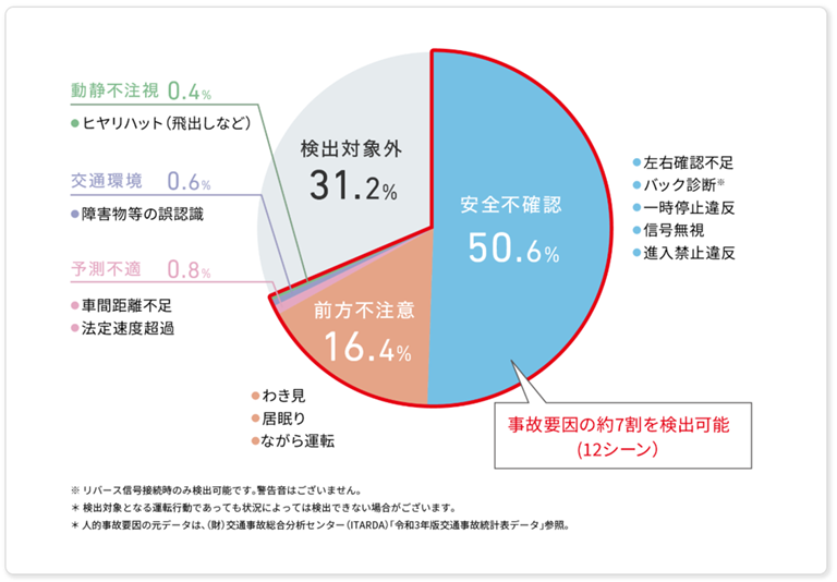 人的事故要因の約7割を占める、安全不確認や前方不注意など主要な12シーンをAIが自動で検出し、管理者や運転者に警告、通知することができます。さらに、信号無視や車間距離不足といった6シーンは、リアルタイムに警告することも可能です。