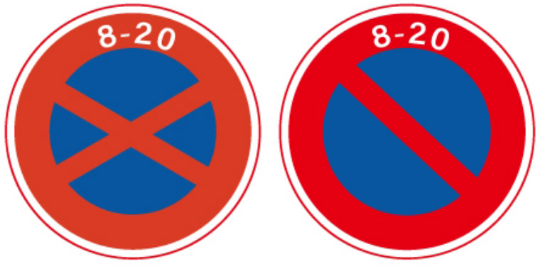 駐停車禁止(左)と駐車禁止(右)の標識。上部の数字は禁止の時間帯を指す。