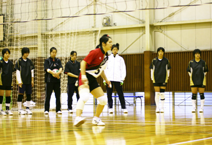 今回のバレーボール教室は京都府立向陽高等学校女子バレーボール部の皆さんを富士通テン体育館にお迎えして行いました。 向陽高校バレー部の監督さんは、私たちと同じ9人制で活動している群馬銀行の元バレーボール選手。強豪チームで活躍していた監督さんが指導するだけあって、1人1人のバレーボール技術も高く、礼儀正しい生徒さんばかりで私たちの士気も上がります。