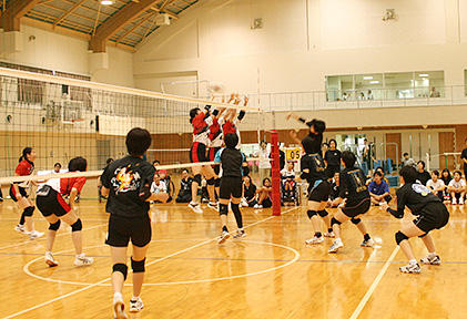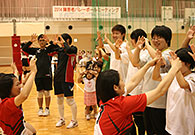 午後からは当社バレーボール部によるミニバレー教室に加えて姫路南高校女子バレーボール部との9人制対6人制のデモンストレーションを行った後、午前中に紹介していただいた三つのバレーを参加者全員で体験試合し、大いに盛り上がりました。