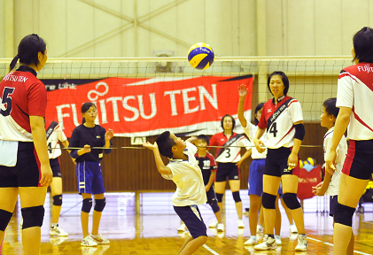 バレーボールのいちばんの魅力はスパイク。でも、なかなかうまく打てません。ボールを叩きつける感覚を繰り返して覚えます。最後は選手といっしょにゲームを行いました。一生懸命ボールを追いかけて、暑さも吹き飛ばして、元気いっぱい盛り上がりました。