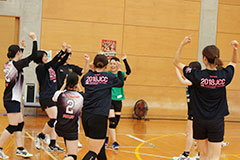 教室が始まる前に、私たちが紅白戦を行い観戦していただきました。感想を聞くと、「皆さんネットプレーを使うタイミングが上手です」「スピードが速くて目が追いつきませんでした(笑)」と面白い回答もあり、会場が笑いに包まれました。紅白戦の後、早速教室へ入りましたが、ママさんの場合あまり長くウォーミングアップをするとバテてしまうので、すぐにボール練習に入りました。9人制特有のネットプレーやオーバーカットを中心に練習に取り組み、最後は選手が一緒のコートに混ざりゲームを行ないました。「選手の皆さんと一緒にやっていると自分が上手になった気がします!」「いつもよりラリーが続いて楽しい!」と息を切らしながらお話をされていました(笑)。これからも怪我をしないようほどほどにバレーボールに取り組んでいただければと思います。