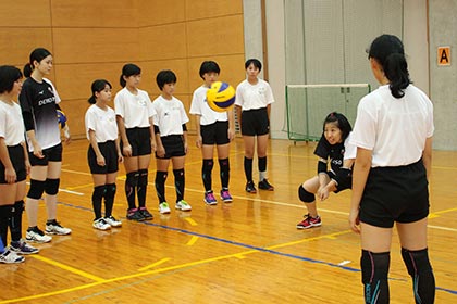 高校生・大学生の部は参加人数が20名ほどだったので、選手がマンツーマンで指導にあたりました。選手がプレーを披露すると、「すごい・・・」と言葉を失い呆気にとられながらも食い入るように見ていました。「間近で見るプレーは迫力があり、実業団の選手でも必死にボールを追いかけて、声を出して練習するのに驚きました」と高校生が言うように、私たちはバレーボール教室でも常に全力で取り組みます! 1対1でじっくりアドバイスをしつつ、ときには一緒に混ざって練習を行ない、楽しさの中にも厳しさがある時間を共有できたのではないかと感じました。