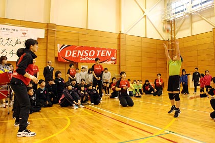 「自分たちの得意なバレーボールで何かできないか」。そんな想いから2012年7月より「復興支援バレーボール教室」を継続的に実施しています。同県での教室は今年で8回目。昨年に引き続き、デンソーテンとサンデン女子バレーボール部が協力し福島県伊達市と相馬市へ伺いました。今回、伊達市では小学生約80名、相馬市では中学生約160名、総勢240名を対象にバレーボール教室を行いました。
