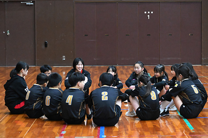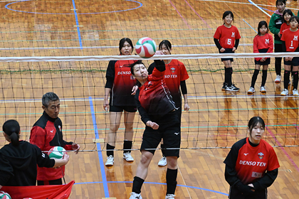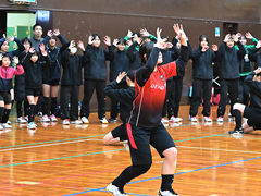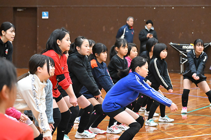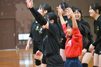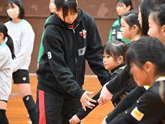 クリニック2日目。この日のウォーミングアップは5人で一列になって、大野選手の言葉に合わせて前後左右に飛ぶ「言うこと一緒、やること一緒」ゲーム。後の休憩の合間にも自分たちでやるくらい盛り上がりました。2日目は、受講生によってどちらか1日だけ、2日間とも参加といろんな人がいるので最初は1日目のおさらいから。今日が初めてだという人には選手が丁寧に教えながら個別練習を行いました。その後は2日間の成果を見せるミニゲームを行い、1日ながらも昨日のゲーム形式よりもさらに動きが良くなっていて「上手くなってる!」「すごい!」と指導担当の選手たちが声を掛けていました。