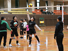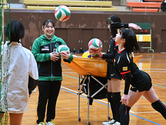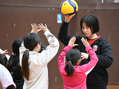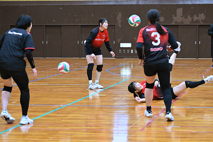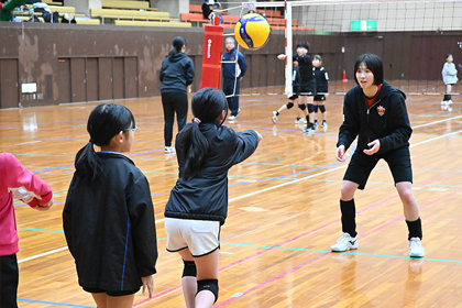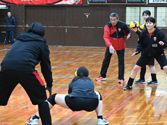 それが終わるとオーバーハンドパスとアンダーハンドパスの練習。慣れてきたら、ボールを1回真上に上げてから相手に返すようにして、ボールコントロールの感覚を掴みます。パス練習を経て強打レシーブの練習をする頃には「来い!」と大きな声が出るようになり、活気のある練習に。このほか、午前中は3人でコートを守る3人レシーブやサーブレシーブを重点的に行いました。「オーバーで取るつもりで動くと早くボールの下に入れるよ」「セッターや次の人が上げやすいところにボールを上げることを意識して」など、選手のアドバイスに応えるようにめきめき上手くなっていく受講生たちに驚かされました。