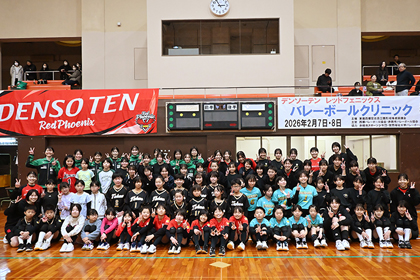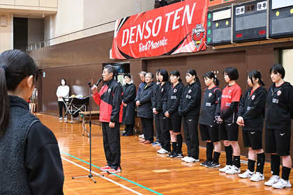 クリニック終了後はレッドフェニックスによる公開練習を行いました。先程までとは打って変わって真剣な表情でボールを追いかけ、コート両面で行われるハードな3人レシーブを見つめる受講生の姿も。